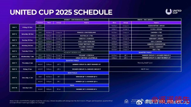 2025年联合杯网球混合团体赛将于2024年12月27日-2025年1月5日在澳大利亚的珀斯和悉尼2座城市举行。比赛共有18个国家参赛,分为6个小组,每个小组3支队伍。其中,A、C和E组在珀斯出战,B、D和F组在悉尼出战。
