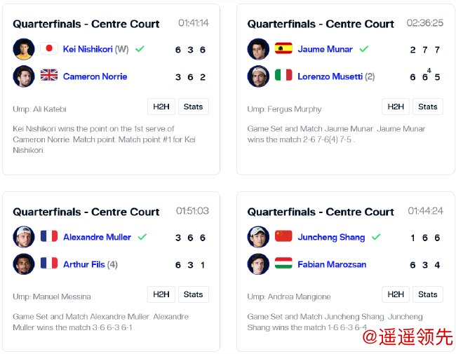 另一场比赛中,西班牙选手穆纳尔耗时2小时36分钟,鏖战三盘,在先输一盘的情况下,连扳两盘,以2-6/7-6(4)/7-5逆转2号种子穆塞蒂,艰难挺进四强。至此,本届香港赛的8位种子选手全部被淘汰出局。